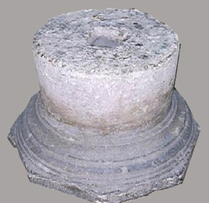 Como parte de los instrumentos litúrgicos (píxide; lancia o cuchillito; cucharilla cochlear; tintinabulum o campanilla; pátera), destaca el hallazgo de un disco cerámico datado a finales del s. VI y empleado como marcador de obleas sagradas, que además ha permitido identificar la advocación del templo a la Virgen María. La pieza cerámica, que aparece decorada con un gran pavo real o ave fénix y otros elementos que evocan la divinidad y eternidad en el cristianismo, presenta un grafito conservado en estado incompleto, en el que se leen dos caracteres, B V […], habiendo perdido presumiblemente la tercera letra, interpretada como una M. La identificación del grafito como las siglas del texto Beata Virgo Maria en el objeto de uso litúrgico ha conducido a establecer en el lugar la presencia de una iglesia dedicada a la Virgen María, Santa María de Elo, elemento significativo en estos primeros momentos de cristianización.